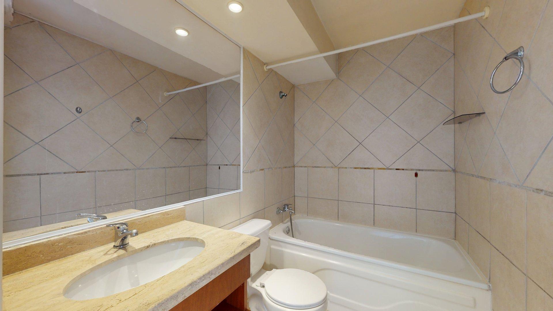 - Baños equipados con tina y vanitorios con elegantes cubiertas de mármol travertino.